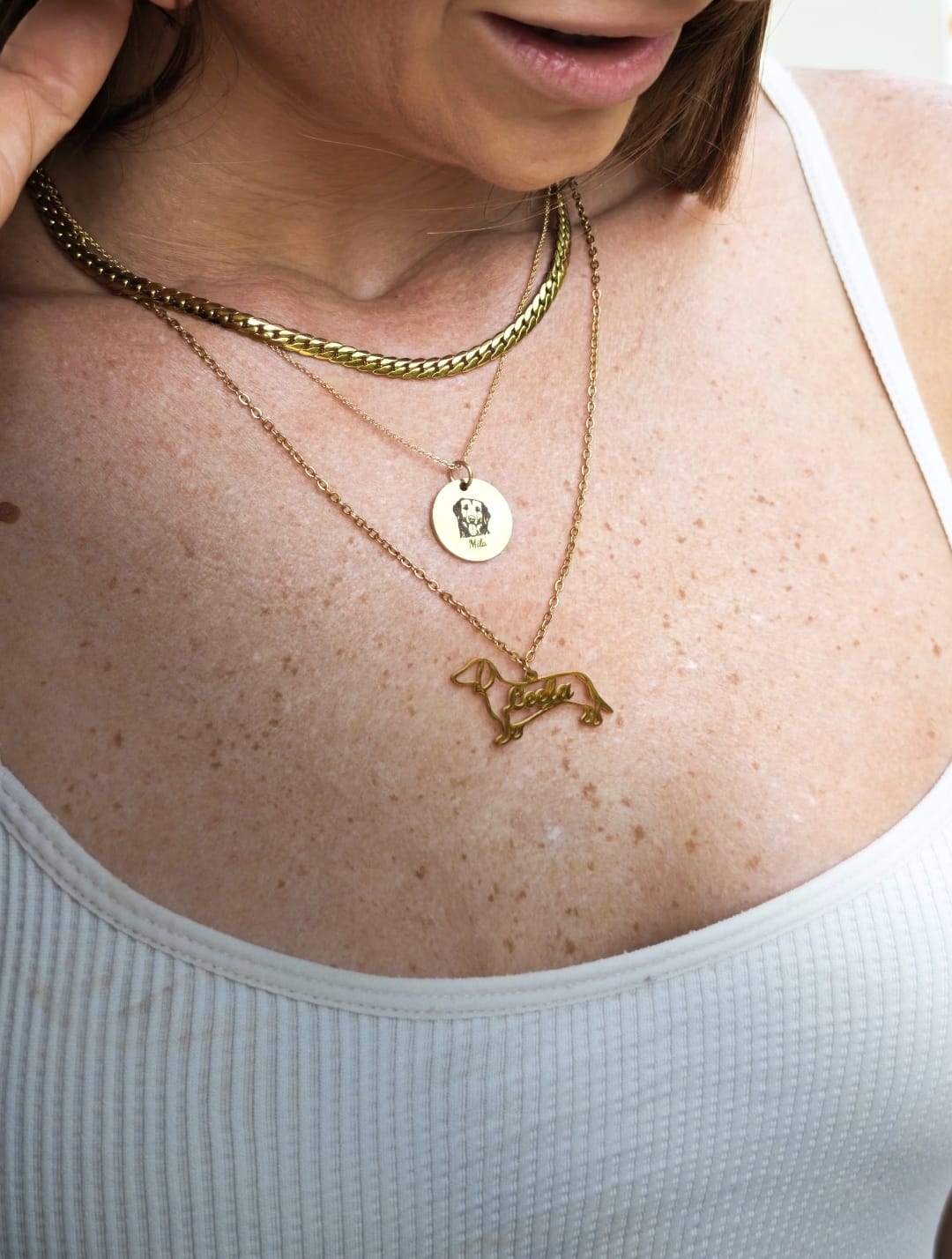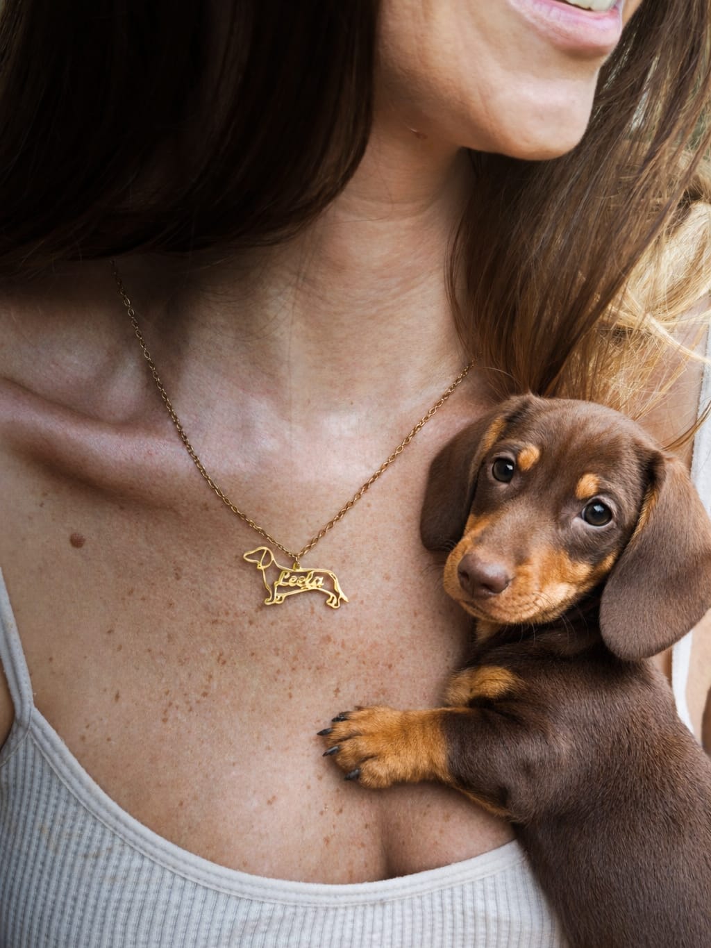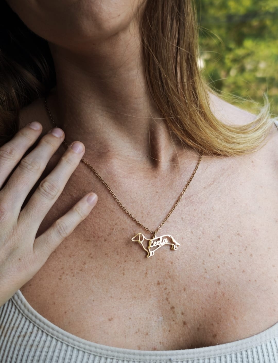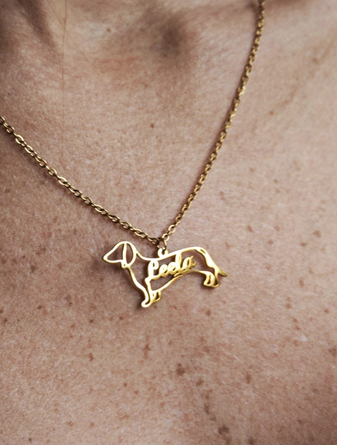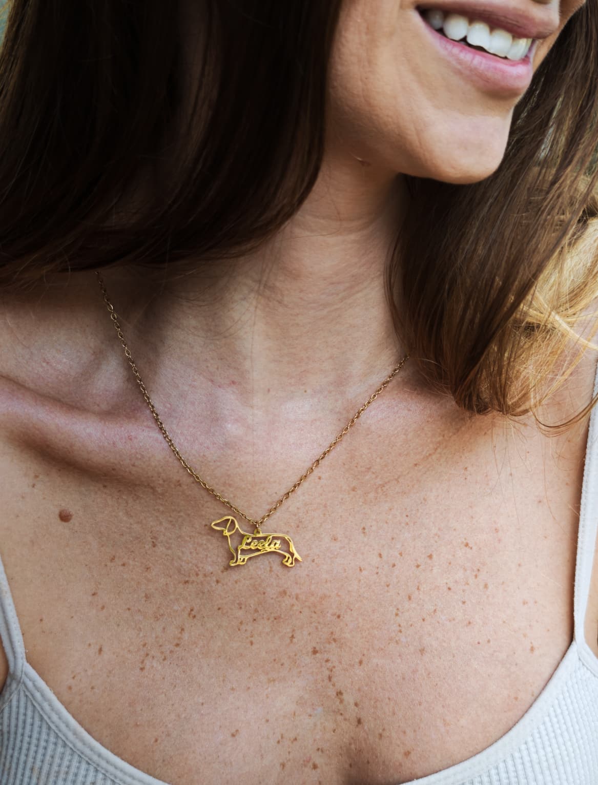 Crafted in high-quality stainless steel and available in silver or gold, the Leela necklace transforms your pet’s breed silhouette into a personalised name pendant. Choose from a range of dog breeds and add their name seamlessly through the centre to create a piece that is entirely yours.