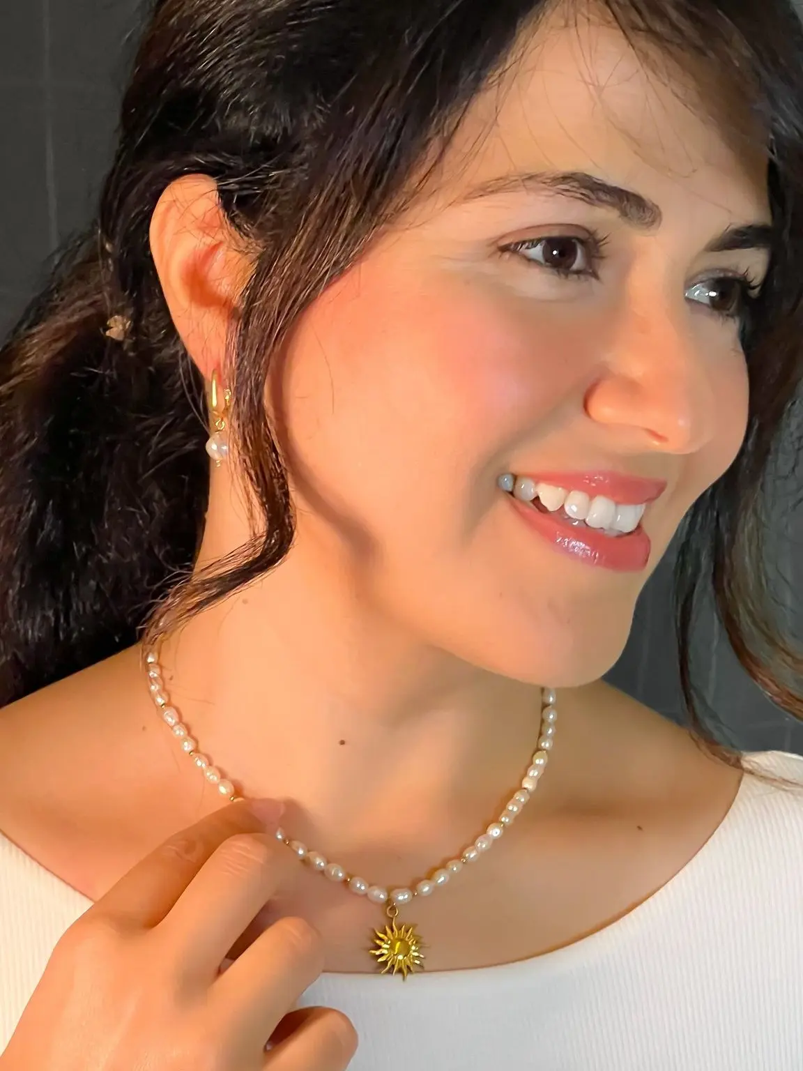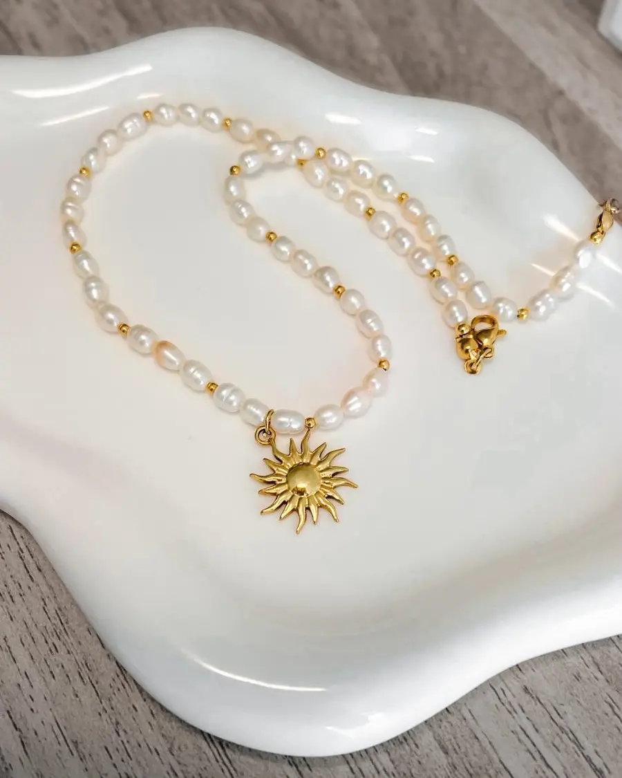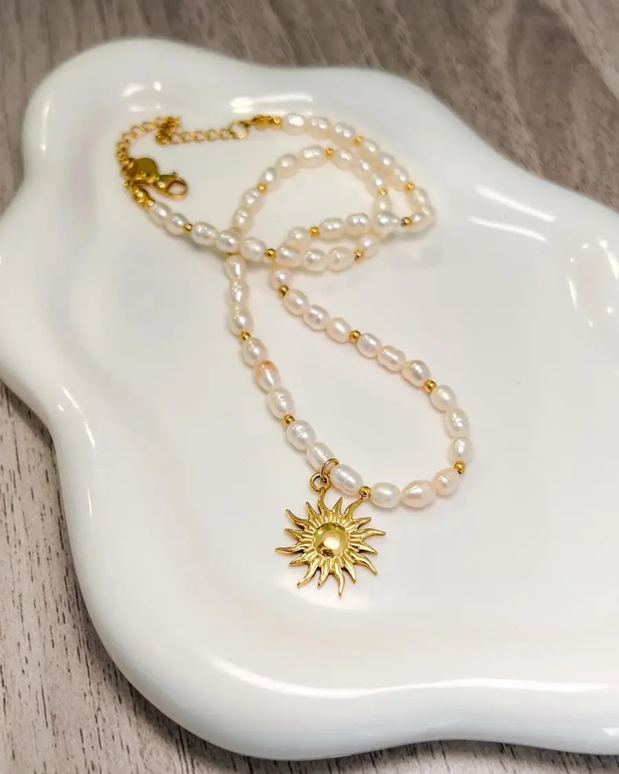 Our Aurora Sun necklace is made from freshwater pearls, stainless steel, gold plating which is optional for those wanting a warm gold finish.