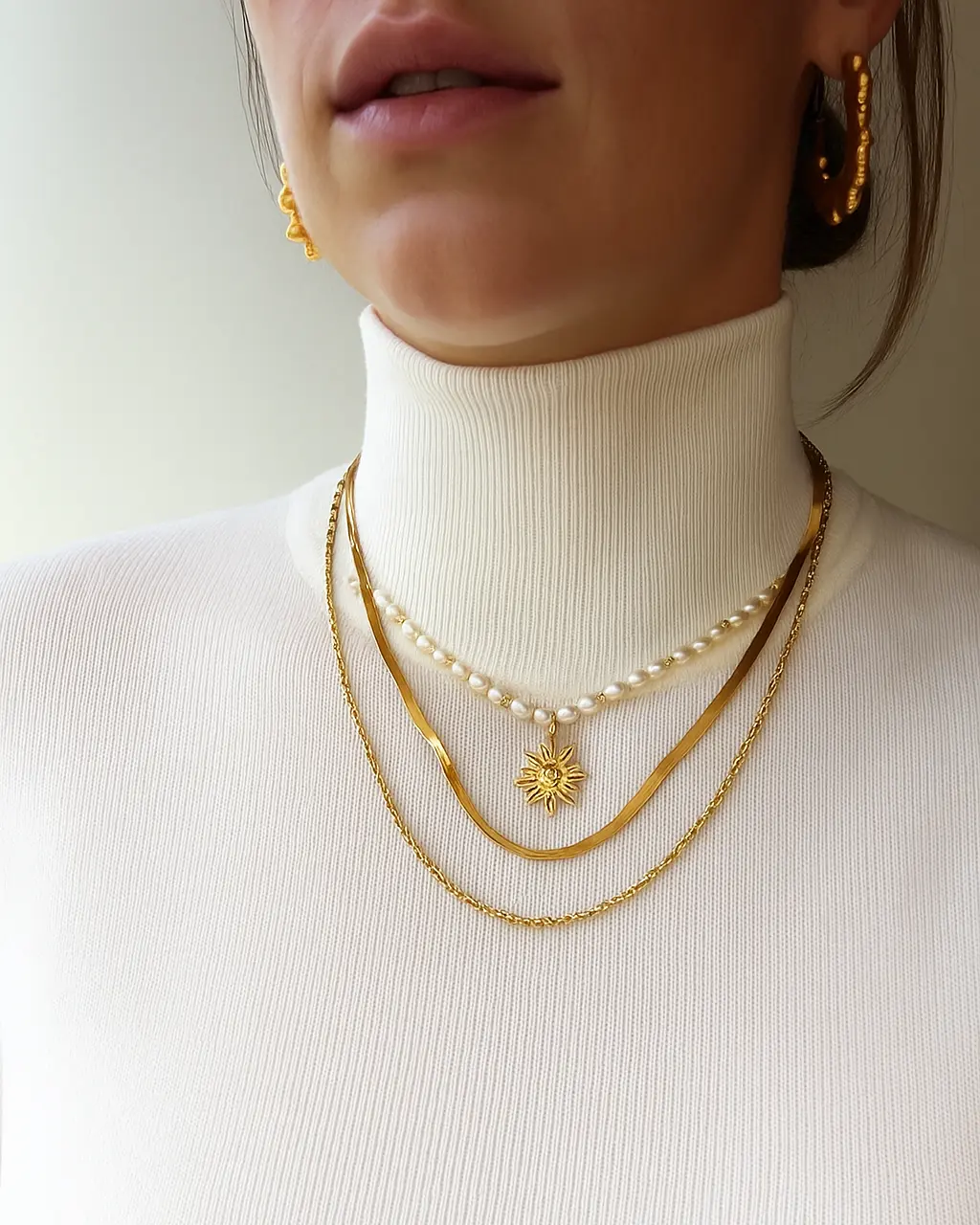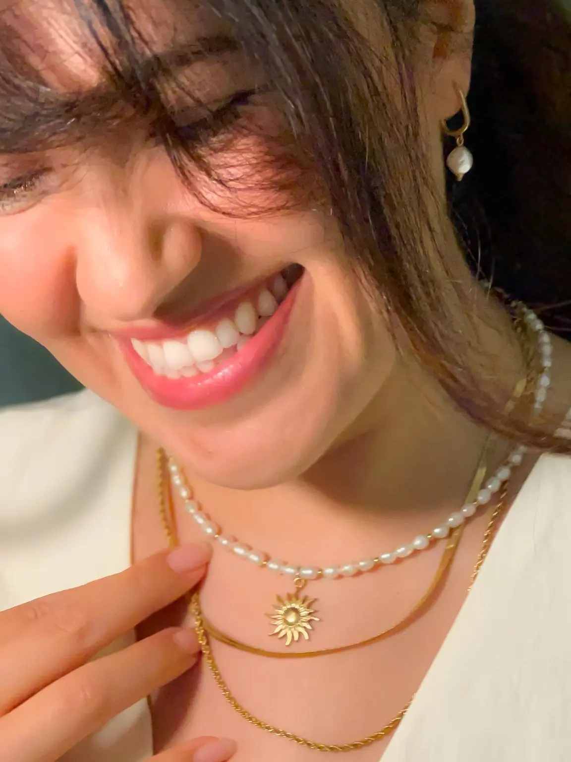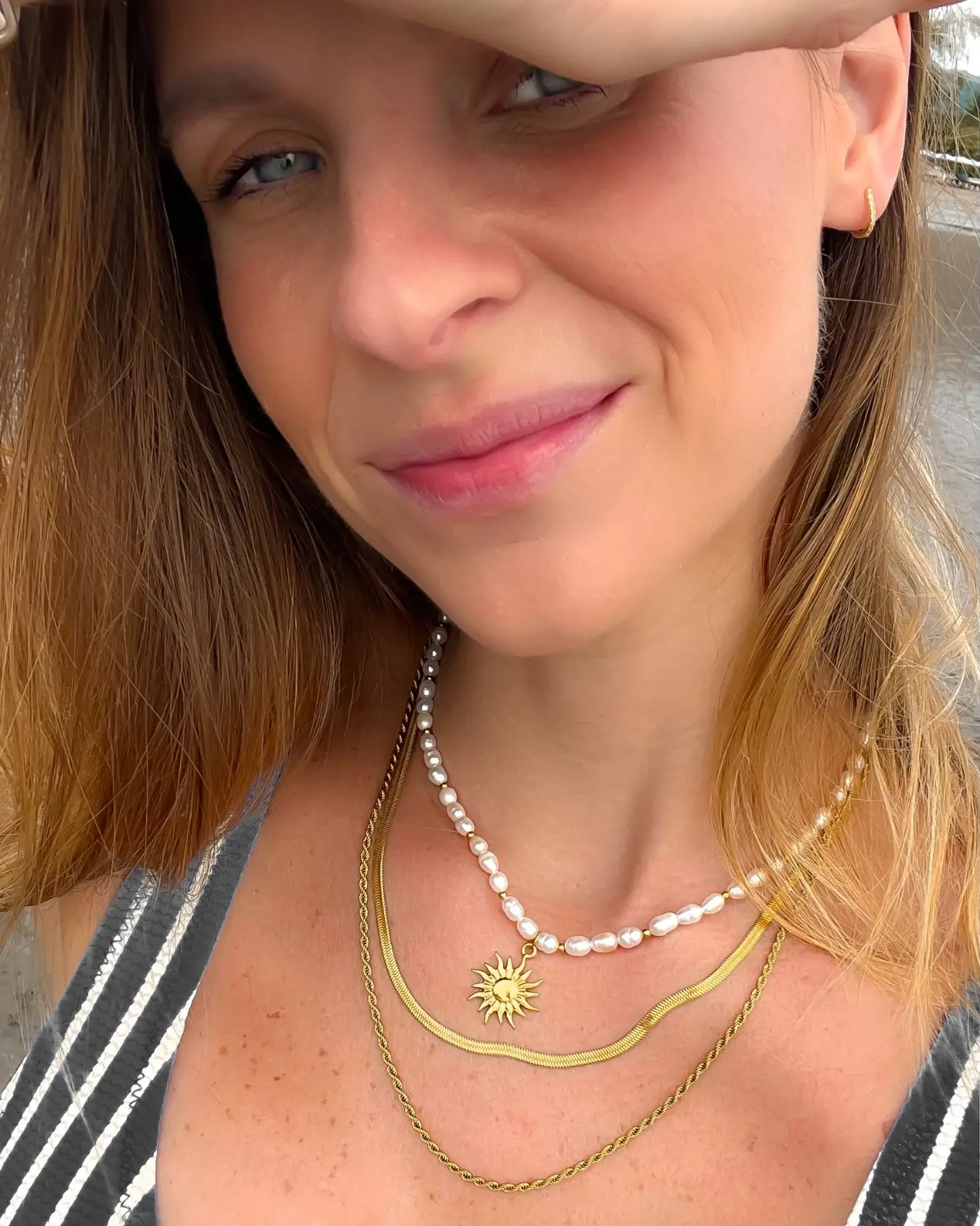 Our Aurora Sun necklace is made from freshwater pearls, stainless steel, gold plating which is optional for those wanting a warm gold finish.