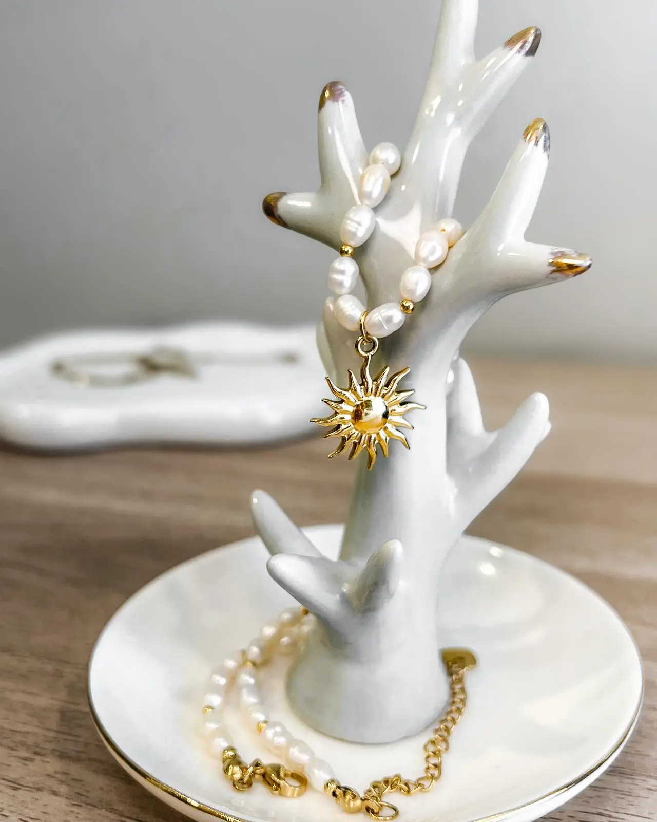 The Aurora Sun necklace features a delicate strand of freshwater pearls and a stainless steel sun warmed with a gold finish. Elegant and enduring, it is a beautiful reminder of light and hope.