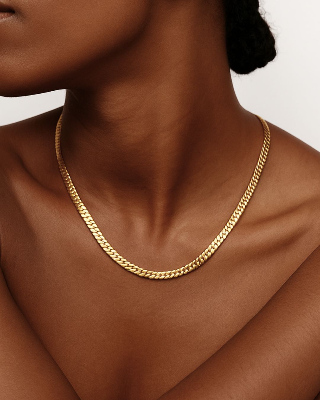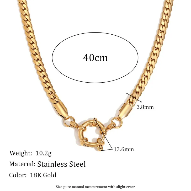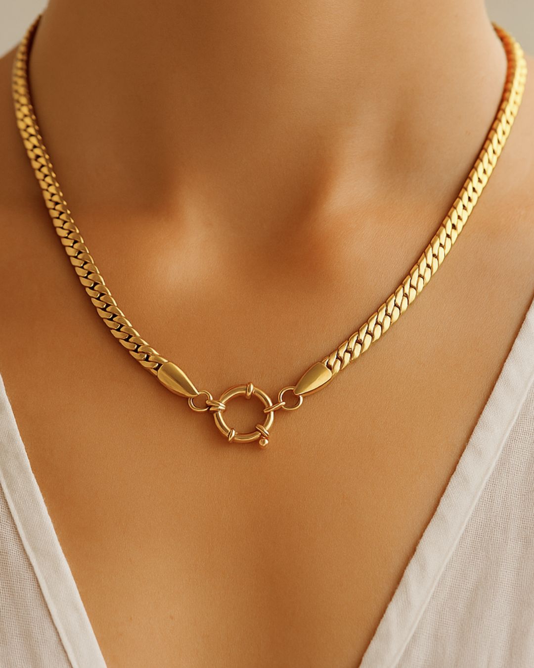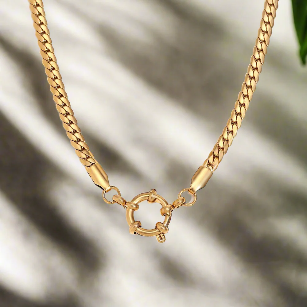 Cinda Curb redefines modern minimalism with a touch of golden luxury. Designed with a geometric chain and spring fastener pendant, it’s an unforgettable classic. Crafted from high-quality stainless steel and coated in radiant 18K gold, this piece blends strength and sophistication in equal measure.